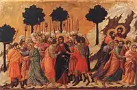 | Traición de Judas | Temple sobre madera | 50 × 53 cm | Opera del Duomo | Frente a un marco arquitectónico presidido por una galería abierta de arcos de medio punto los sacerdotes pagan a Judas por su traición, rodeados de sus esbirros. De la imagen destaca el trabajo de los ropajes, con amplios pliegues, en tonos rojo y azul, un cromatismo habitual en el conjunto elaborado por Duccio. Bajo la galería hay que destacar igualmente los arcos de las bóvedas, elaborados de forma convincente.[38] | ![]() |