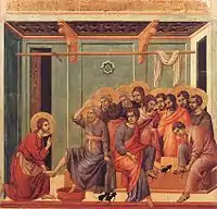 | Lavatorio de los pies | Temple sobre madera | 50 × 53 cm | Opera del Duomo | La escena se desarrolla en una habitación de paredes verdes y techo de artesonado color marrón, con una barra que atraviesa la estancia de parte a parte y de la que pende una tela blanca a la derecha. Jesús se dispone a lavar los pies a sus discípulos; el primero, Pedro, se lleva la mano a la cabeza para señalar a su maestro: «Señor, no solo los pies, sino también las manos y la cabeza».[37] | ![]() |