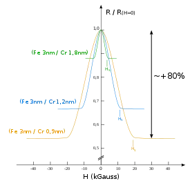 La magnetorresistencia gigante (MRG) es un efecto mecánico cuántico que se observa en estructuras de película delgada compuestas de capas alternadas ferromagnéticas y no magnéticas. Se manifiesta en forma de una bajada significativa de la resistencia eléctrica observada bajo la aplicación de un campo magnético externo: cuando el campo es nulo, las dos capas ferromagnéticas adyacentes tienen una magnetización antiparalela puesto que están sometidas a un acoplamiento ferromagnético débil entre las capas. Bajo efecto de un campo magnético externo, las magnetizaciones respectivas de las dos capas se alinean y la resistencia de la multicapa cae de manera súbita. Los espines de los electrones de la sustancia no magnética se alinean en igual número de manera paralela y antiparalela al campo magnético aplicado, y por tanto sufren un cambio de difusión magnética en una menor medida respecto a las capas ferromagnéticas que se magnetizan de forma paralela.