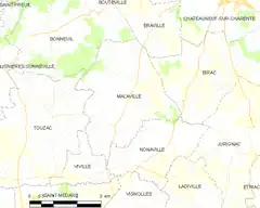 Malaville era una comuna francesa situada en el departamento de Charente, de la región de Nueva Aquitania, que el uno de enero de 2017 pasó a ser una comuna delegada de la comuna nueva de Bellevigne[3] al unirse con las comunas de Éraville, Nonaville, Touzac y Viville.