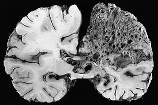 ![]() Vista macroscópica de malformación arteriovenosa en el lóbulo parietal. | ||