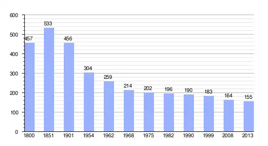 Los datos demográficos contemplados en este gráfico de la comuna de Malicorne[4] se han cogido de 1800 a 1999 de la página francesa EHESS/Cassini, y los demás datos de la página del INSEE.[5]
