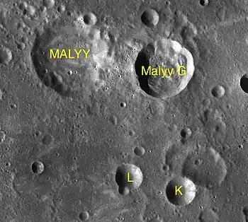 Por convención estos elementos son identificados en los mapas lunares poniendo la letra en el lado del punto medio del cráter que está más cercano a Malyy.