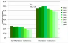 Para las cuatro instituciones con mandatos de autoarchivo más antiguas, el porcentaje promedio de acceso abierto por auto-archivo ha sido comparado con el porcentaje de artículos de control de otras instituciones publicadas en las mismas revistas (por año 2002-2009). Los mandatos de acceso abierto triplican el porcentaje de AA verde (ver figura).[15][16] Los totales respectivos están derivados de la Web de Science de Thomson Reuters.