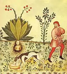 La leyenda asegura que todas las raíces de mandrágora se transforman en hombrecitos de verdad, como pequeños duendes, y que se dedican a favorecer al dueño de la planta. No asegura la leyenda que todas las raíces de mandrágora tengan forma humana. Que la tienen algunas, sí. Y que éstas son las verdaderas plantas hechiceras. El afortunado poseedor de una raíz de mandrágora en forma de hombrecito sostiene que esta planta, en el momento de arrancarla grita. Y que el grito mata a quien intenta arrancarla. Y que el procedimiento para arrancarla y salvar la vida es el siguiente. Se cava hondo alrededor de la raíz hasta ponerla al descubierto. Mientras no se intente arrancarla no hay peligro. Se ata una cuerda a la raíz y el otro extremo se ata al cuello de un perro. Se llama al perro desde cierta distancia. El perro quiere acudir, tira de la planta y la arranca, grita, y el perro muere.[3]