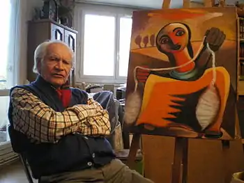 ![]() El artista con su cuadro La Hilandera, en 2008. | ||