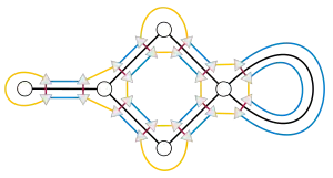 El mapa de un grafo codificado para un grafo embebido es otro grafo cúbico junto con un 3-coloreado de aristas de . Cada arista de se expande en exactamente cuatro vértices en , uno para cada opción de lado y el punto final de la arista. Una arista en conecta cada vértice con el vértice que representa el lado opuesto y el mismo extremo de . Estos bordes son por convención de color rojo. Otro borde en conecta cada vértice con el vértice que representa el extremo opuesto y el mismo lado de ; estos bordes son por convención de color azul. Una arista en del tercer color, amarillo, conecta cada vértice con el vértice que representa otra arista que se encuentra con en el mismo lado y punto final. [1]