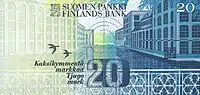 20 marcos | Verde/azul | 20 - KAKSIKYMMENTÄ MARKKAA - TJUGO MARK - Väinö Linna - SUOMEN PANKKI | 20 - Kaksikymmentä markkaa - Tjugo mark - Puente de Tammerkoski - SUOMEN PANKKI - FINLANDS BANK - Escudo de Finlandia |