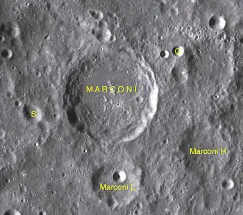 Por convención estos elementos son identificados en los mapas lunares poniendo la letra en el lado del punto medio del cráter que está más cercano a Marconi.