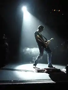 ![]() Kutxi Romero en plena actuación de Marea en el concierto fin de la gira "Piojoso Tour 2008" en el Pabellón Olímpico de Badalona. | ||
