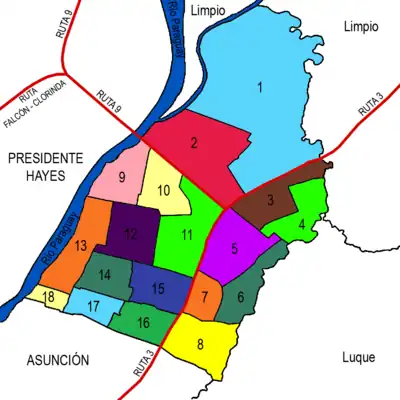 | Noroeste: Río Paraguay y Villa Hayes | Norte: Limpio y Arroyo Itay | Nordeste: Limpio y Luque |
