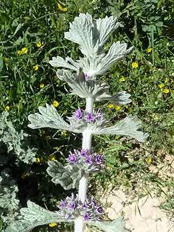 Es una planta herbácea perenne sufruticosa de 20-45 cm de altura, con tallos más o menos cuadrangulares, con abundante indumento blanquecino, frecuentemente lanudo. Las hojas, de 1,5-4 por 1-2cm, son cuneadas, flabeladas, de irregularmente dentadas a lobuladas, algo rugosas por el haz y con nervadura marcada por el envés, con indumento afelpado muy denso, blanquecinas y con pecíolo de 1-3cm, muy largo en las inferiores. Las inflorescencias, de 10-20 cm, están formadas por verticilastros con 12 flores o más cada uno, más o menos próximos, ocasionalmente espiciformes. Las brácteas, de 1-2,5 por 0,8-1,5cm, son sésiles o no. Las flores, sésiles, tienen el cáliz con un tubo de 4-5 mm, lanudo, con 5 nervios anchos y 5 dientes de 2-5 mm, triangulares, punzantes, en la fructificación dispuestos en estrella, patentes, endurecidos, a veces los 2 inferiores algo más largos; mientras la corola, de 4-5 mm, esa de color púrpura, con márgenes blanquecinos, el labio superior bífido, estrecho, erecto, y el inferior con 2 lóbulos laterales cortos y estrechos, el central mayor, semiorbicular, a veces emarginado, todos muy pelosos por fuera. Los frutos son esquizocárpicos en tetranúculas, con mericarpos de color castaño, de 2-2,5 por 1-1,5 mm, elipsoides, aplanados, con ápice agudo y una coronilla de pelillos en la base.[1]