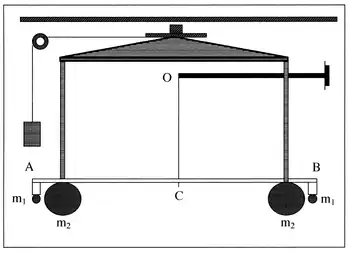 Mediante la medición de F, m1 y m2, se obtiene el valor de G. El dispositivo de Michell consiste en una barra horizontal AB, con centro C y una longitud de 6 pies, suspendido de un punto fijo O con un alambre en posición vertical con una longitud OC de 40 pulgadas (102 cm). Las esferas de plomo tienen 2 pulgadas de diámetro, cuya masa m1 vale[nota 2] (4π/3) (2 x 2,54/2)³ x 11,34 ≅ 778,4 gramos, suspendidas en A y B por medio de dos alambres cortos. Este equipo se encuentra en un armario de madera estrechos. En el exterior pero próximas a este dispositivo, Michell había colocado dos grandes bolas de plomo de 8 pulgadas de diámetro, cada una con una masa aproximada de 50 kg (exactamente 49,8176 kg). Estas dos masas grandes m2 se colocan a ambos lados del plano OAB, cerca de las dos masas pequeñas m1, por lo que cada par de masas (m1, m2) se atraen con una fuerza F=Gm1m2/d² que actúan en una dirección horizontal perpendicular al plano OAB. El hilo OC se tuerce, por la acción de este par de fuerzas, un ángulo horizontal θ que se puede medir utilizando, por ejemplo, un sistema óptico. Sea k la constante torsional del hilo OC. En el equilibrio se tendrá, kϑ = 2Gm1m2/d², de donde se puede despejar G = kϑd²/(2m1m2), siempre que podamos medir la constante de torsión del alambre. Para ello, se evalúa el momento de inercia I1 de la barra con las esferas pequeñas m1ABm1, en relación con el eje OC; y en una experiencia auxiliar se mide el período de oscilación de la barra con las esferitas alrededor de OC cuando el sistema de grandes bolas de masa m2 se retira. Si T1 fuese este período, se puede calcular k = 4π²I1/T1². Por lo tanto, se cuantifica el valor de la constante G a partir de cantidades medibles M1, M2, L, d, θ, I1 y T1.