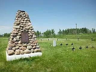 Frog Lake se convirtió en parte de la provincia de Alberta en 1905. El sitio de la masacre fue designado "Sitio histórico nacional de Frog Lake" en 1923, en la ubicación del Cree levantamiento que ocurrió en el Distrito de Saskatchewan, Territorios del Noroeste.[15] Parks Canada dice que el sitio designado por la Junta de Sitios y Monumentos Históricos de Canadá es extenso, pero el servicio de parques nacionales posee solo una pequeña porción, principalmente un cementerio, donde en 1924 se erigieron un túmulo de piedra y una placa federal. Las coordenadas geográficas de esta página son para ese cairn.
