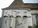 - Originalité de cette construction, le chemin de ronde en encorbellement est décalé de 45° par rapport au parti de baee, un carré de contreforts médians.