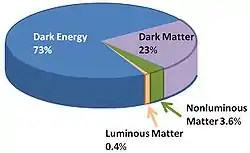 Fully 70% of the matter density in the universe appears to be in the form of dark energy. Twenty-six percent is dark matter. Only 4% is ordinary matter. So less than 1 part in 20 is made out of matter we have observed experimentally or described in the standard model of particle physics. Of the other 96%, apart from the properties just mentioned, we know absolutely nothing.Lee Smolin: The Trouble with Physics, p. 16