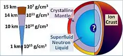 Debido a su extrema densidad, el núcleo de una estrella de neutrones no cae en ningún otro estado de la materia. Mientras que una enana blanca es casi tan masiva como el Sol (hasta 1,4 masas solares, el Límite de Chandrasekhar), el principio de exclusión de Pauli impide el colapso a un radio menor, y se convierte en un ejemplo de materia degenerada. En contraste, las estrellas de neutrones están entre 1,5 y 3 masas solares, y alcanzan una densidad tal que los protones y los electrones son triturados para convertirse en neutrones. Los neutrones son fermiones, el colapso se ve aún más impedido por el principio de exclusión, formando la llamada materia degenerada de neutrones .[61][62]