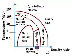 En esta definición, la presión crítica es cero: el verdadero estado fundamental de la materia es siempre materia de quarks. Los núcleos que se ven en la materia que nos rodea, que son gotitas de la materia nuclear, son en realidad metaestable, y dado el tiempo suficiente (o el estímulo externo a la derecha) se desintegraría en gotas de materia extraña, p.ej. strangelets ".