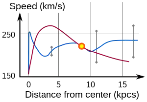 En astronomía y cosmología, la materia oscura es materia de composición desconocida que no emite o refleja bastante radiación electromagnética como para ser observada directamente, pero cuya presencia se infiere de sus efectos gravitacionales sobre la materia visible [85] [86]