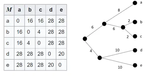 El siguiente es un ejemplo de una matriz de distancia ultramétrica con su correspondiente árbol.