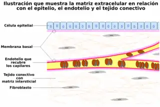 ![]() Ilustración que muestra la matriz extracelular (membrana basal y la matriz intersticial) en relación con epitelio, endotelio y tejido conectivo | ||