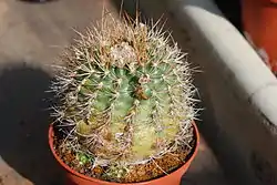 Es una planta perenne carnosa, globosa-cilíndrica con las hojas de color verde armada de espinas y con las flores de color rojo.