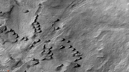 Las dunas de arena, denominadas barjanes, son un fenómeno relativamente habitual en Marte, donde abundan tanto el viento como la arena.[7] De color oscuro por los materiales basálticos dominantes en Marte, constituyen una interesante muestra de la actividad geológica, cuyo comportamiento es directamente observable y medible.[8]