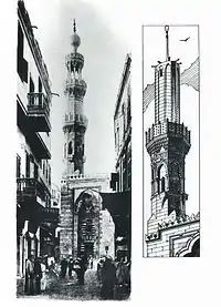 - La estructura de baja calidad se agregó en 1397 o 1412. Doris Behrens-Abouseif: The minarets of Cairo. Islamic architecture from the Arab conquest to the end of the Ottoman Empire. With contributions by Nicholas Warner. Photographs by Bernard O’Kane. I.B. Tauris, London-New York, 2010, p. 205. ISBN 978-1-84885-539-7.