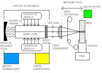 El láser refuerza la luz mediante absorción e irradiación de energía. Se dirige energía a una barra de cristal (cuerpo del láser) o a una mezcla de gas especial (gas del láser). Esta energía se produce a través de la luz ( lámparas de rayos o diodo láser), o mediante una descarga eléctrica.