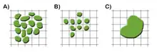 En los modelos con cuadrícula (figura 1), un cuadradito puede estar ocupado por varias células, lo que permite modelar una gran población celular (tipo A); estar ocupado por una única célula (tipo B), lo cual se consigue, por ejemplo, mediante triangulación de Delaunay y diagramas de Voronoi; o una única célula puede ocupar varios cuadrados (tipo C). Este último modelo se conoce como modelo celular de Potts (Cellular Potts Model). Cada uno de estos tres métodos permite describir el efecto de las fuerzas mecánicas de una célula sobre su entorno o sobre un grupo de células vecinas. Existe también un cuarto método, llamado LGCA (Lattice Gas Celular Automaton), en el cual se añade una variable “velocidad”. Generalmente contiene varias células en un mismo cuadrado.[45]