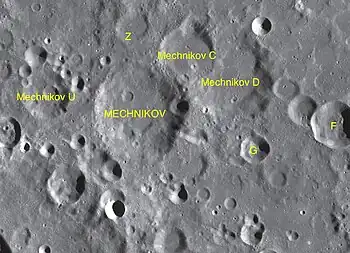 Por convención estos elementos son identificados en los mapas lunares poniendo la letra en el lado del punto medio del cráter que está más cercano a Mechnikov.