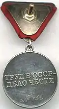En el reverso de la medalla se halla la inscripción ТРУД В СССР – ДЕЛО ЧЕСТИ (Trabajar en la U.R.S.S. es una Cuestión de Gloria).
