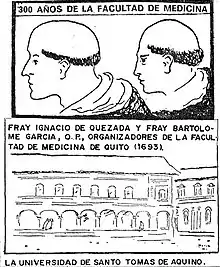 Durante el siglo XVII la principal Universidad de la Audiencia de Quito fue la Universidad San Gregorio de la orden jesuita. Sin embargo, los dominicos buscaron la creación de la Universidad de Santo Tomás que tendría como característica principal la incorporación de una facultad de medicina, algo que estaba ausente en la San Gregorio donde se enseñaba teología, derecho y artes (liberales). El proceso de la creación de la universidad y la apertura de la facultad sería por lo demás largo, puesto que se debía justificar la necesidad de una segunda universidad para la Audiencia. Estas universidades, cabe aclarar, no eran reales, como la de Nueva España o Lima, es decir creadas por el rey de España, sino más bien eran universidades religiosas administradas por distintas órdenes, vinculadas a la educación de sacerdotes y misioneros. Por esta razón a través de una cédula real el 13 de abril de 1693, se abrió la "Cátedra de Medicina", en la Universidad dle Santo Tomás de Aquino, de los dominicos (algunos de ellos ya tenían título profesional y eran médicos graduados en otras universidades). Los principales protagonistas de este hecho fueron Fray Ignacio de Quesada y Fray Bartolomé García. La cátedra inició con dos catedráticos, doctores, Antonio Montesdeoca y Juan de Alvarado. En esa época eran los únicos médicos titulados que ejercían en Quito durante ese año. La cátedra se llevaba a cabo en las aulas de la universidad que se encontraba en el convento de Santo Domingo. Existe el registro de los primeros estudiantes graduados: Diego de Herrera y Diego Cevallos. La forma en la que se organizó la carrera era en tres años que se llamaban: Prima, Vísperas y Método respectivamente. Asimismo, el currículum que se estudiaba era:[5]