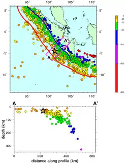 En este límite de placa, se producen terremotos a lo largo del mega empuje de Sunda y dentro de las placas subductoras y dominantes. Los terremotos más grandes se generan cuando se rompe el propio megathrust. Los estudios de terremotos recientes e históricos muestran que el mega empuje está segmentado.[1] Los terremotos más grandes ocurren en parches separados a lo largo de la superficie del mega empuje (1797, 1833, 1861, 2004, 2005 y 2007), con eventos más pequeños que ocurren en los límites entre estos parches (1935, 1984, 2000 y 2002).[1] El área de ruptura del evento de 1861 parece ser muy similar a la del evento de 2005, lo que sugiere que puede considerarse como un evento repetido. El evento de 2007 se interpreta como una falla parcial del área de ruptura del evento de 1833.[1]