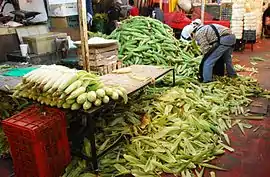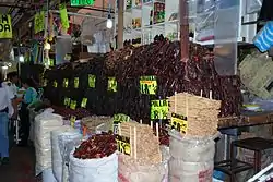 Los alimentos típicos de México son la columna vertebral de estos mercados que venden especias mexicanas como el epazote,[1] chiles frescos y secos de casi todas las variedades, nopales, pieles de cerdo enteras fritas, maíz y otros artículos poco comunes, tales como setas silvestres.[5][7] Además de que es uno de los pocos lugares en la ciudad, donde es posible encontrar auténtico queso oaxaca. Los vendedores pueden ser vistos atando las pilas de hojas de plátano, retirando las espinas de los nopales y vendiendo remedios herbales «secretos».[7]