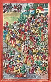 - «Fue precisamente la moderna infantería suiza la que destrozó a la brillante caballería pesada borgoñona en las batallas de Grandson y Morat (marzo/julio de 1476), fracasos que precedieron a la derrota y muerte de Carlos el Temerario durante el asedio de Nancy (1477). Muerto su enemigo, Luis XI procedió a la desmembración e incorporación de Borgoña a la Corona francesa». (http://www.artehistoria.jcyl.es/historia/contextos/1185.htm Archivado el 8 de enero de 2009 en Wayback Machine.)