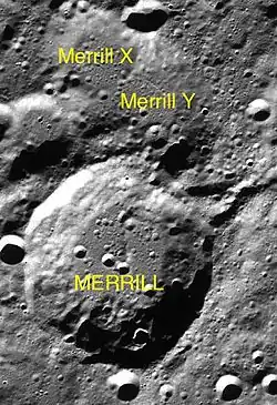 Merrill es un cráter de impacto lunar. Se encuentra en una elevada latitud norte, en la cara oculta de la Luna. A menos de un diámetro al sur-suroeste de Merrill se halla es el cráter Niepce de similar tamaño, y al este, sobre la extremidad norte aparece Brianchon, más grande.