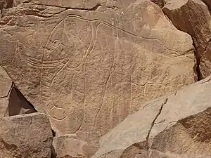 Graziosi encuentra numerosos grabados en los que se suceden varias fases. En la primera, se encuentran figuras míticas con cabeza de animal, seguida de una fase pastoral, en que aparecen animales domésticos, con collares y pendientes, y también escenas de caza, con rinocerontes y elefantes. También aparecen escenas de caza con caballos, y posteriormente se entra en la fase del camello.
