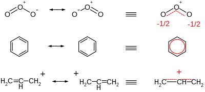 - El concepto del benceno como híbrido de dos estructuras convencionales (en la mitad del esquema 2) fue uno de los hitos importantes de la química, ideado por Kekulé, de tal forma que las dos formas del anillo que representan la resonancia total del sistema se suelen denominar estructuras de Kekulé. En la estructura híbrida a la derecha, el círculo substituye los tres enlaces dobles del benceno.