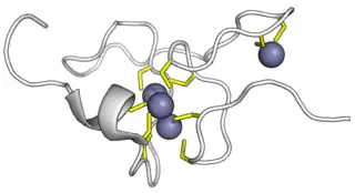 ![]() Estructura de la solución del dominio beta-E del trigo Ec-1 metalotionina (PDB:2KAK). Cisteínas en amarillo, iones de zinc ligados en púrpura.[1] | ||