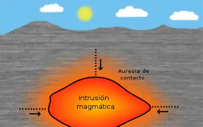 Esquema que muestra la aureola de contacto, o zona de metamorfismo térmico, alrededor de una intrusión magmática