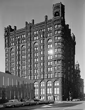 El edificio se considera el primer rascacielos de la ciudad, con 12 pisos y 66 m altura. Pequeñas torres de observación asomaban por encima de las esquinas, y la azotea tenía un jardín popular. Fue construido con granito verde de New Hampshire.[1] Los nueve pisos superiores estaban revestidos de arenisca marrón del lago Superior, extraída por la Portage Entry Red Stone Company.[1]