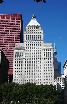 Este edificio en forma de U, de 145 m de altura, está frente a Avenida Míchigan y Grant Park de Chicago. La pirámide de 12 m en la parte superior del edificio (que Schulze & Harrington, autores de Famous Buildings de Chicago, comparan con la Tumba de Mausoleo de Halicarnaso), con su nuevo revestimiento de acero inoxidable recubierto de zinc, tiene su punto máximo un adorno de "colmena" de vidrio de 6 m que contiene una caja de vidrio azul llena de seis bombillas de 1000 vatios que emite una luz azul profunda, una característica prominente del horizonte nocturno de Chicago.[2] La colmena está sostenida por cuatro bisontes de piedra caliza.[9] Debido a este adorno, a veces se le conoce como el "Edificio Colmena".[2]