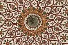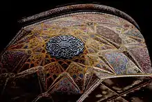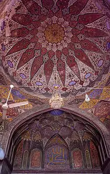 La sala de oración principal contiene un pabellón cuadrado sobre el que descansa la cúpula más grande de la mezquita, una forma persa conocida como Char Taq.[28] En la parte interior de la cúpula hay frescos que representan árboles en parejas, jarras de vino y bandejas de fruta, que son alusiones al concepto islámico del paraíso.[21]