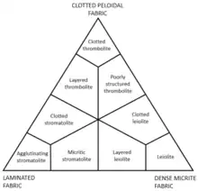 - Trombolitos: cuando no existe un patrón laminado y en su lugar se forman aglomeraciones o clusters esponjosos cumuliformes que crecen concéntricamente.