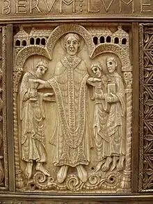 En los marfiles del arca relicario aparece como pastor o como venerable sacerdote curando enfermos o enfrentándose a Satán, al que vence una y otra vez.