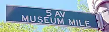 - Street signs saying "Museum Mile" actually extend to 80th Street. "Street View: 80th Street and Fifth Avenue, New York" Google Maps