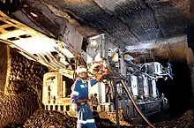 • La minería de muro alto representa alrededor del 50 por ciento de la producción subterránea. La cortadora de muro alto tiene un frente de 300 m (1000 pies) o más. Es una máquina sofisticada con un tambor giratorio que se mueve mecánicamente atrás y adelante a través de una grieta de carbón ancha. El carbón flojo cae en una línea que lleva el carbón al cinturón transportador para ser retirado del área de trabajo. Los sistemas de muro alto tienen su propio techo hidráulico de soporte que avanza con la máquina mientras la minería progresa. Mientras el equipo de minería de muro alto avanza, la roca suprayacente que ya no es soportada por carbón es permitida que caiga atrás de la operación de forma controlada. Los soportes hacen posible niveles altos de producción y seguridad. Los sensores detectan cuanto carbón queda en la grieta mientras que los controles robóticos mejoran la eficiencia. El sistema de muro alto permite un índice de recuperación de carbón del 60 al 100 % cuando la geología circundante lo permite. Una vez que el carbón es removido, usualmente el 75 % de esta sección, el techo es permitido para colapsar de forma segura.[11]