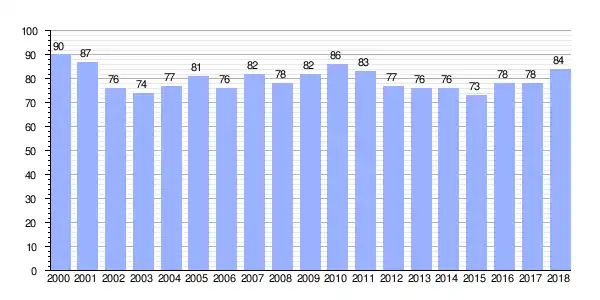 | Gráfica de evolución demográfica de Miodelo entre 2000 y 2018 |