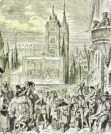 En 1210, sospechando de la creciente popularidad de las obras milagrosas, el Papa Inocencio III emitió una bula que prohibía al clero actuar en un escenario público. Esto tuvo el efecto de transferir la organización de los dramas a los gremios de la ciudad, tras lo cual se produjeron varios cambios. Los textos en lengua vernácula sustituyeron al latín, y se añadieron pasajes no bíblicos junto con escenas cómicas, por ejemplo en la Secunda Pastorum del Ciclo de Wakefield. La actuación y la caracterización se hicieron más elaboradas.